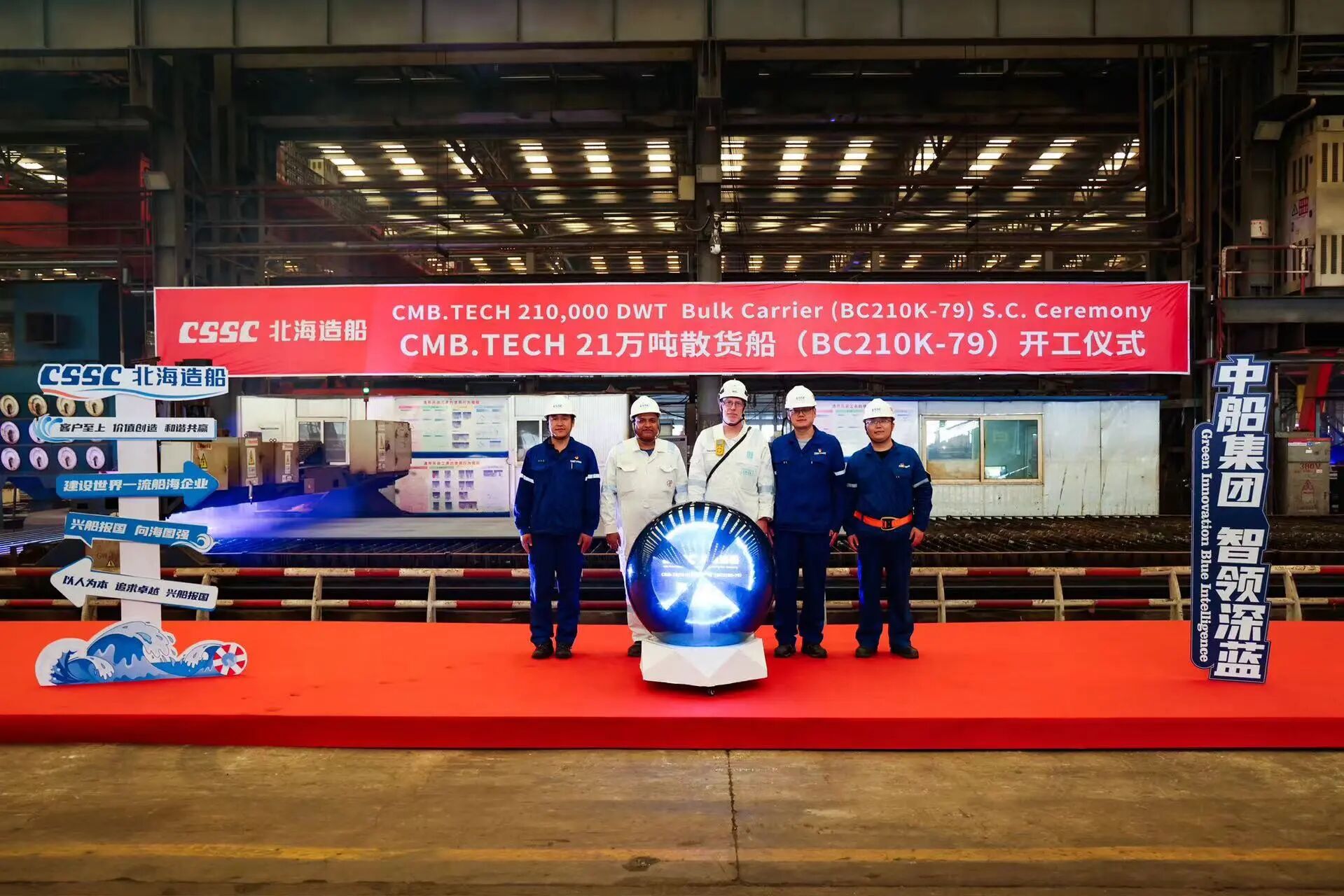 北海造船在2號塢順利完成為比利時CMB.TECH公司建造的21萬噸散貨船56號船與63號船完成鋪底節(jié)點。該型船采用“氨預留”綠色設(shè)計,為未來使用氨燃料動力預留了改造空間。